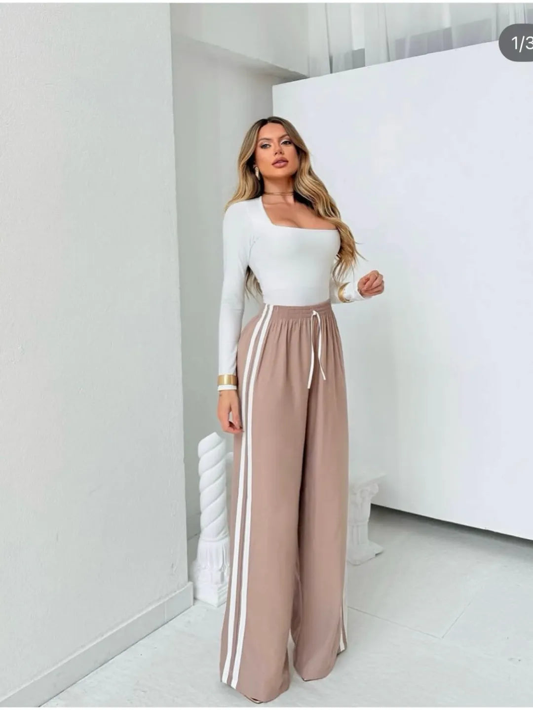 Esta calça pantalona de perna larga possui uma listra lateral, elástico na cintura e bolso, além de ser feita com...