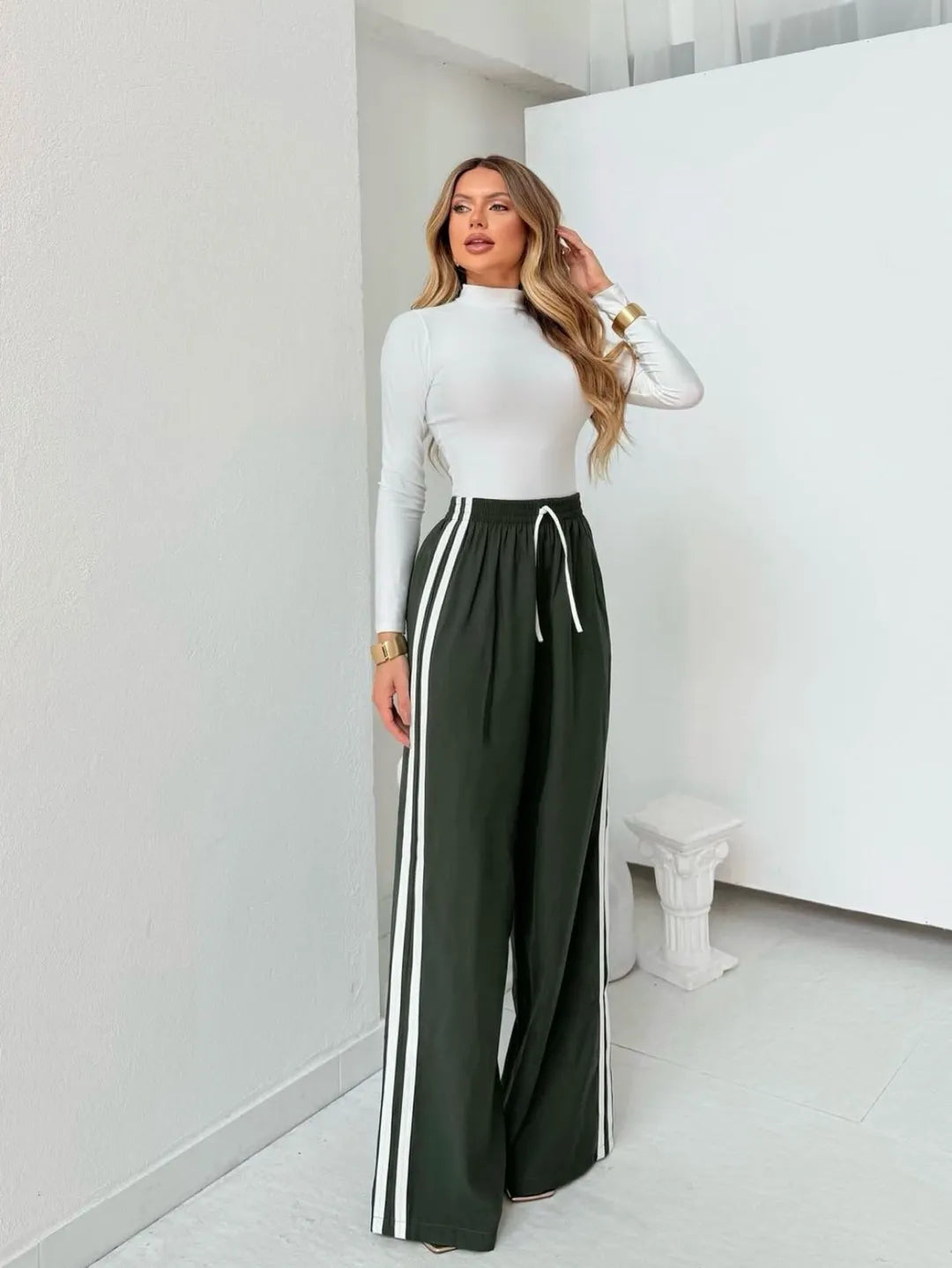 Calça pantalona track pants wid leg, listra lateral, elástico na cintura, bolso, tecido marrant 271