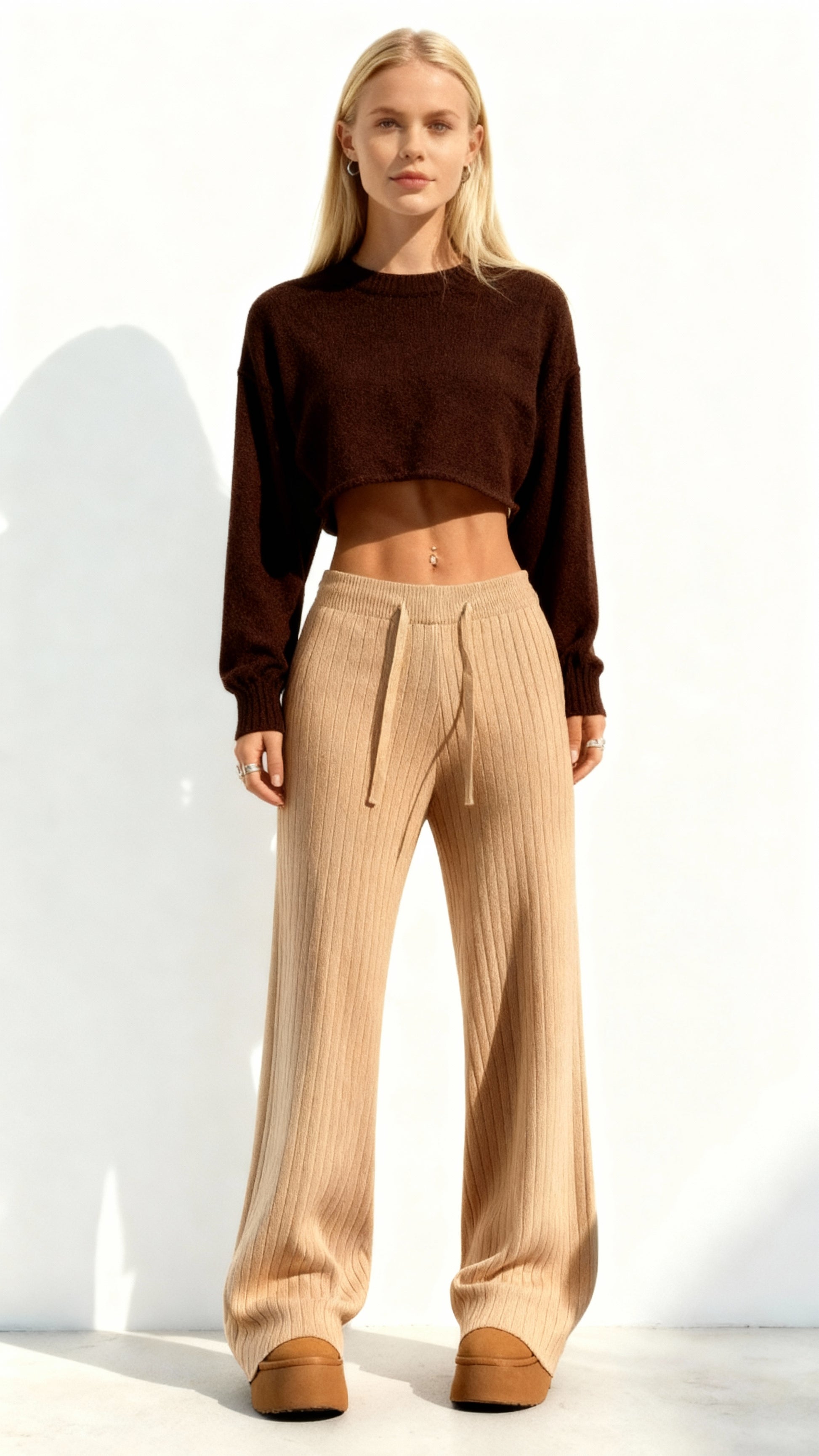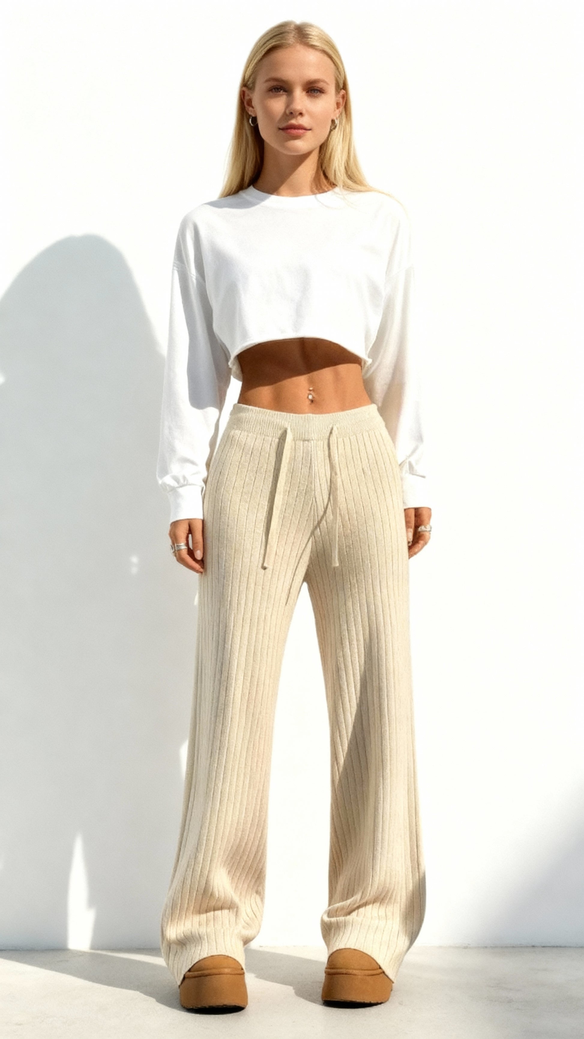 Aproveite o conforto e o estilo com as calças femininas de malha de cintura alta e pernas largas. Feitas com tecido elástico, se ajustam perfeitamente ao corpo e trazem mais liberdade de movimento. Ideal para looks elegantes e descontraídos.