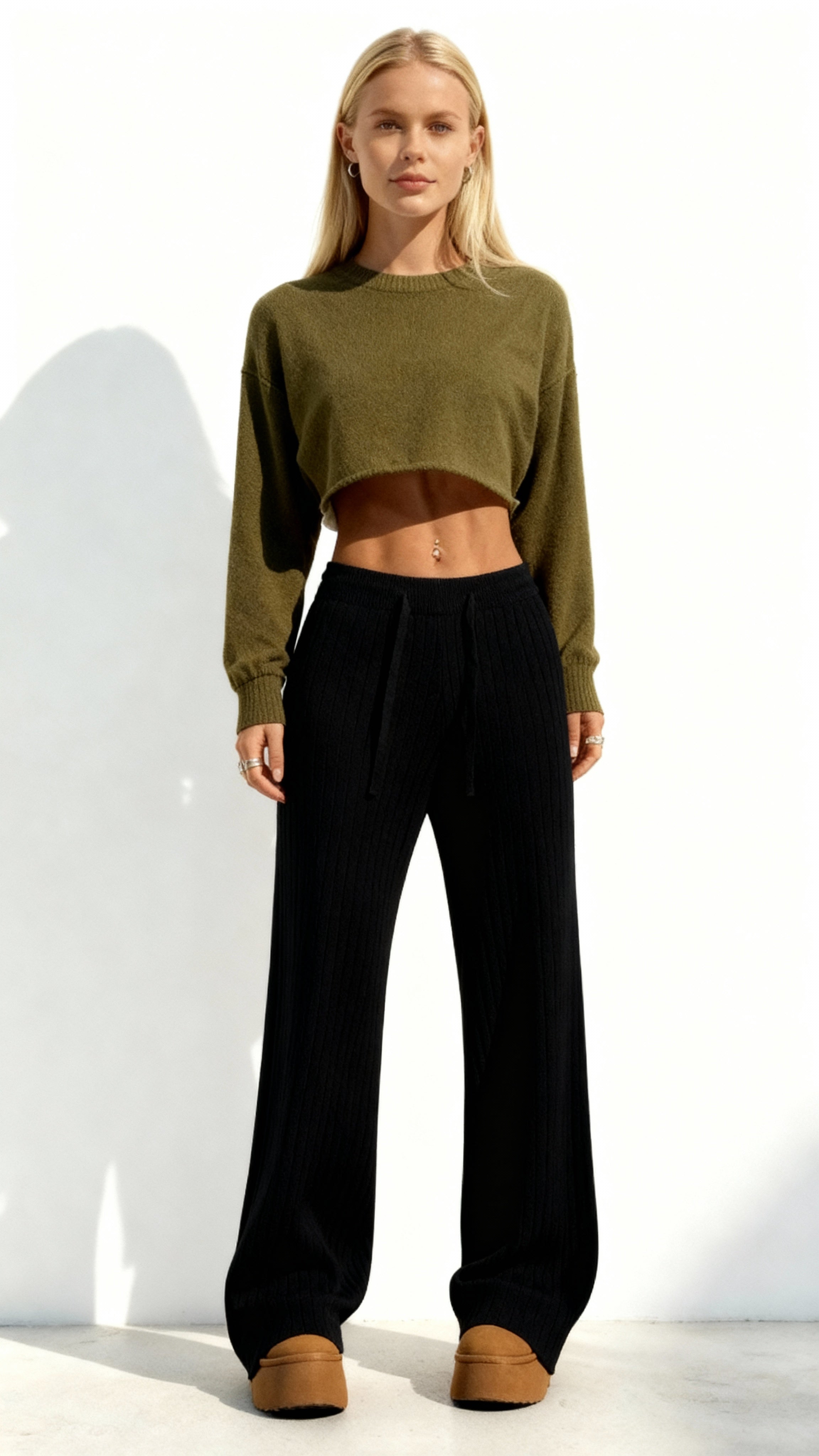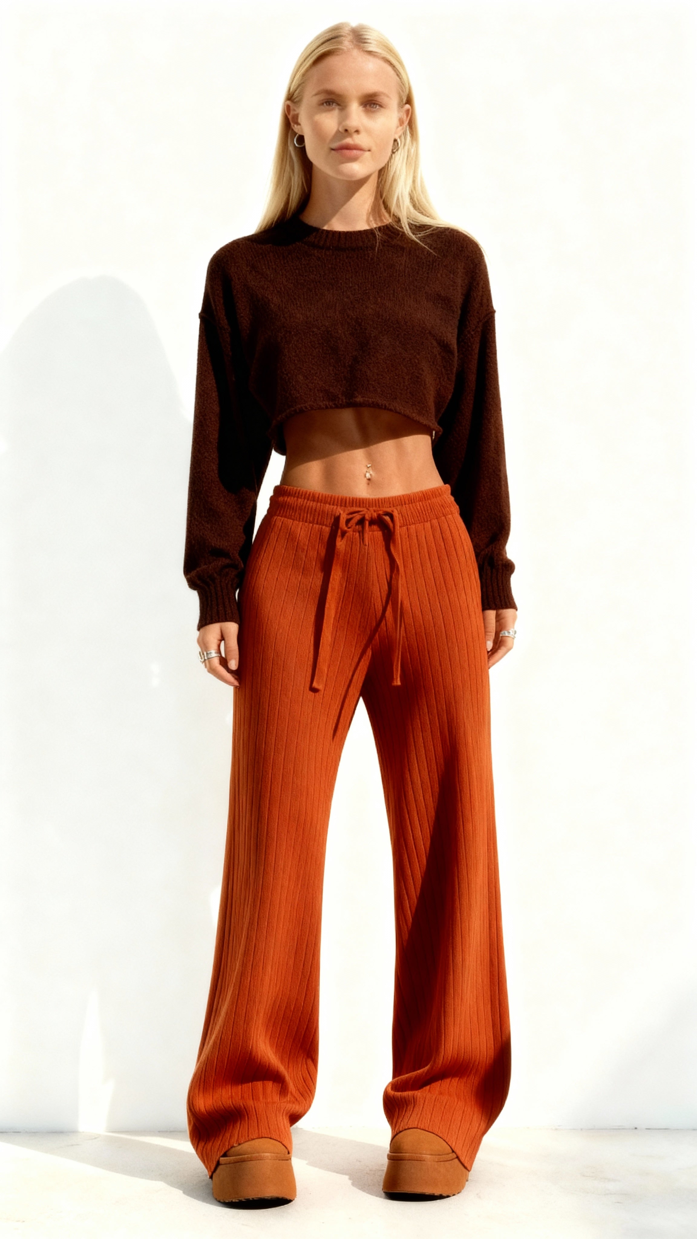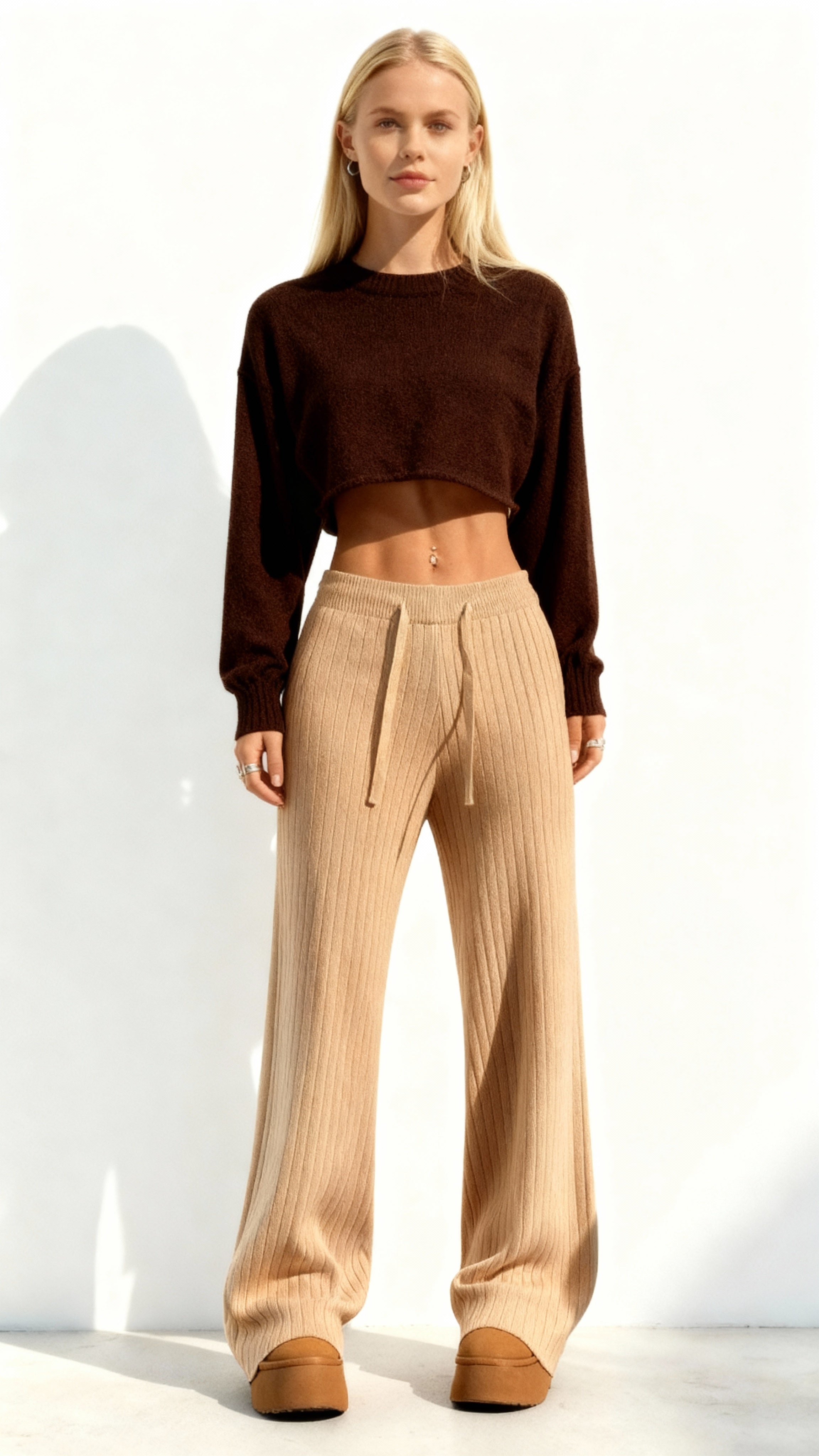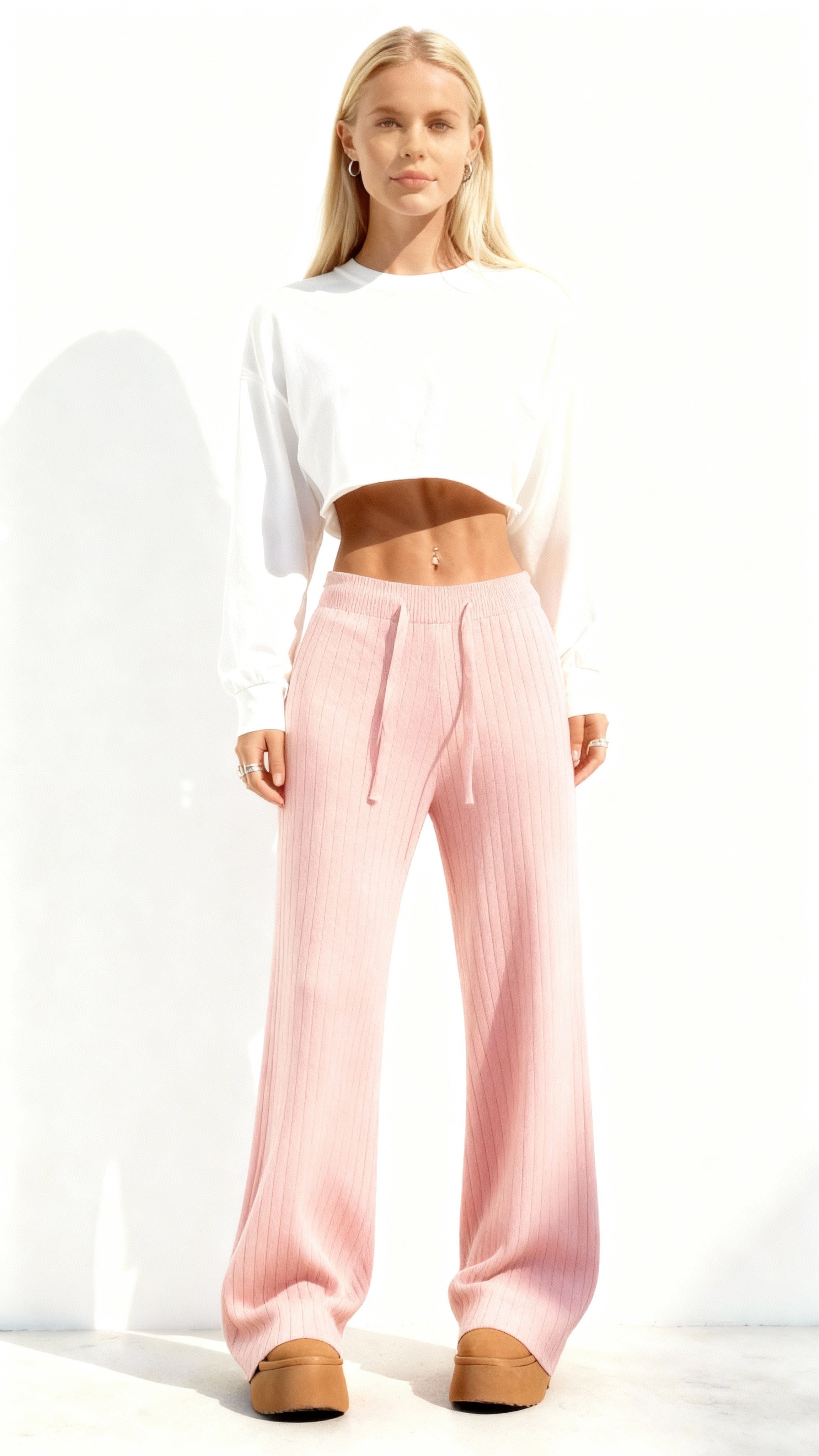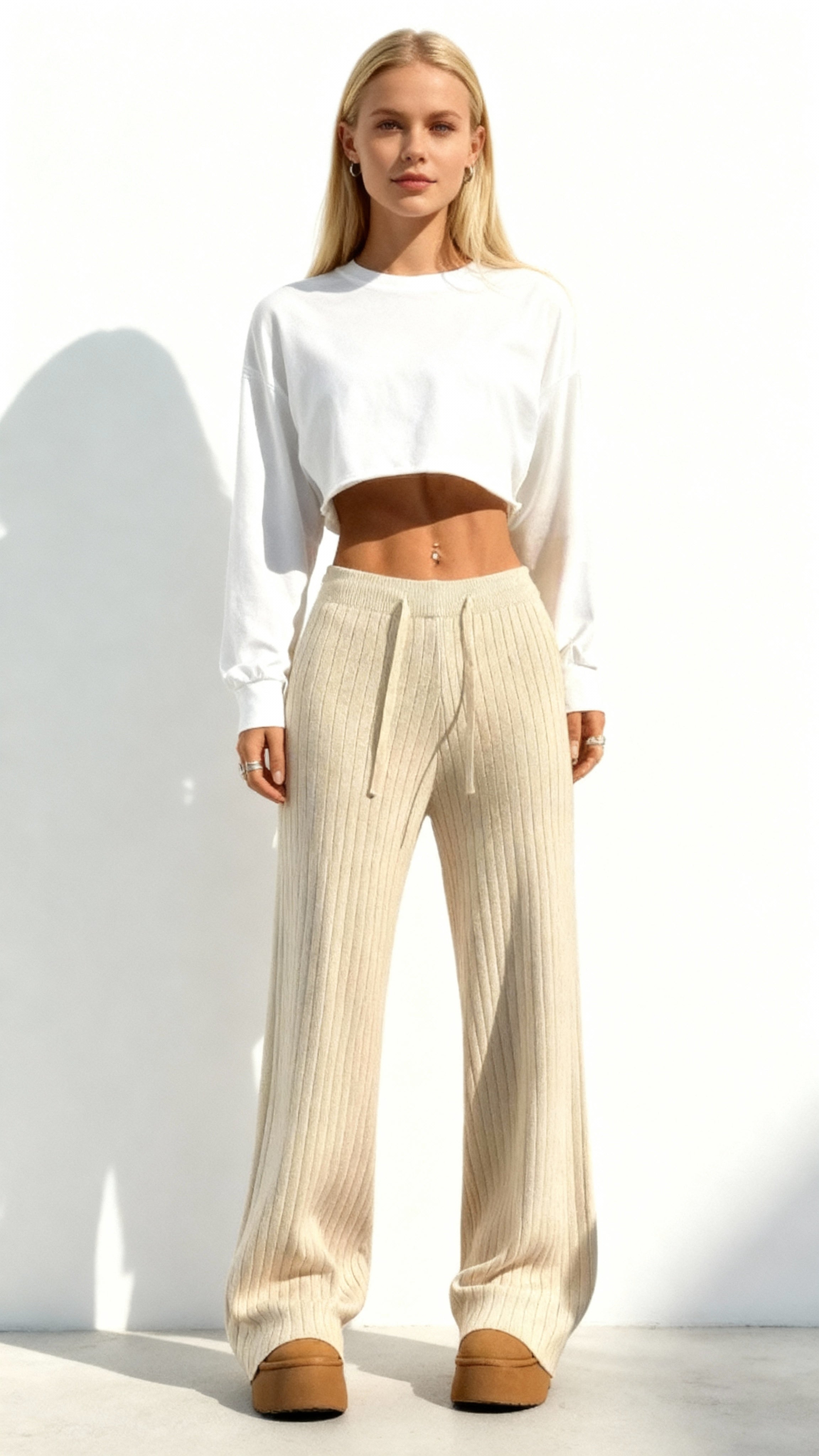 Aproveite o conforto e o estilo com as calças femininas de malha de cintura alta e pernas largas. Feitas com tecido elástico, se ajustam perfeitamente ao corpo e trazem mais liberdade de movimento. Ideal para looks elegantes e descontraídos.