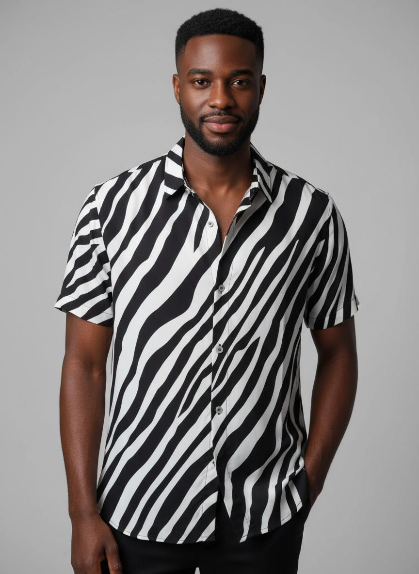 Camisas Slim Masculina Viscose Slim Fit Lisa Alta Qualidade Verao Estampada Preto e Branco Listrado 465