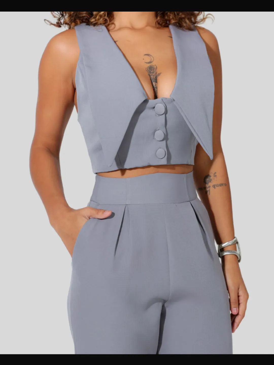 Este conjunto de colete e calça em alfaiataria é perfeito para quem busca elegância e sofisticação. Feito com tecido de alta qualidade, o conjunto garante um caimento impecável e confortável. A alfaiataria clássica é ideal para ocasiões especiais e traz um toque de luxo ao visual.