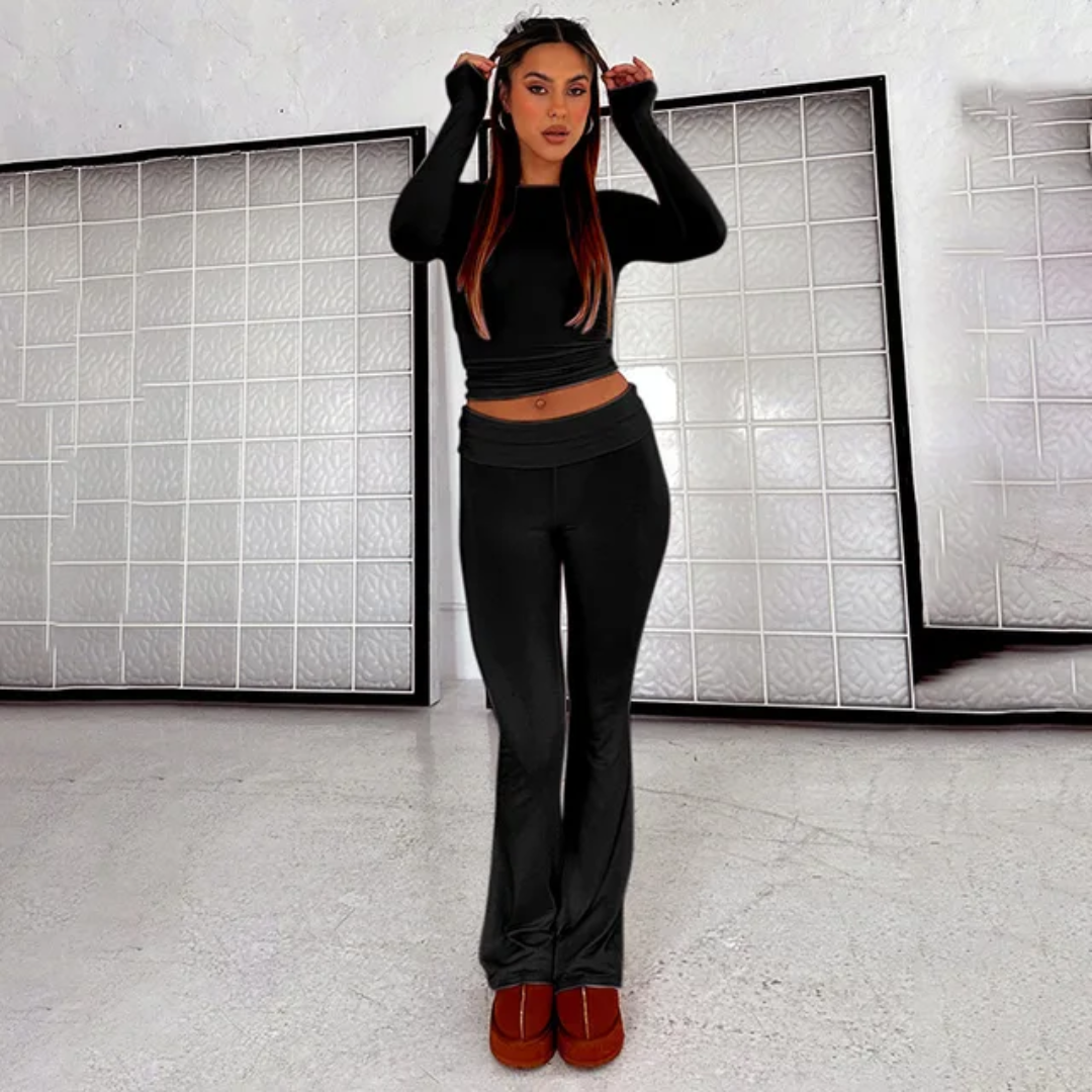 Conjunto Esportivo de Malha Slim Fit de Cor Sólida com Top de Manga Longa e Calça Flare 144