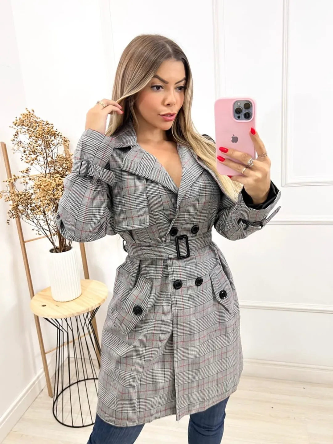 Sobretudo longo xadrez com alças para mulheres 227