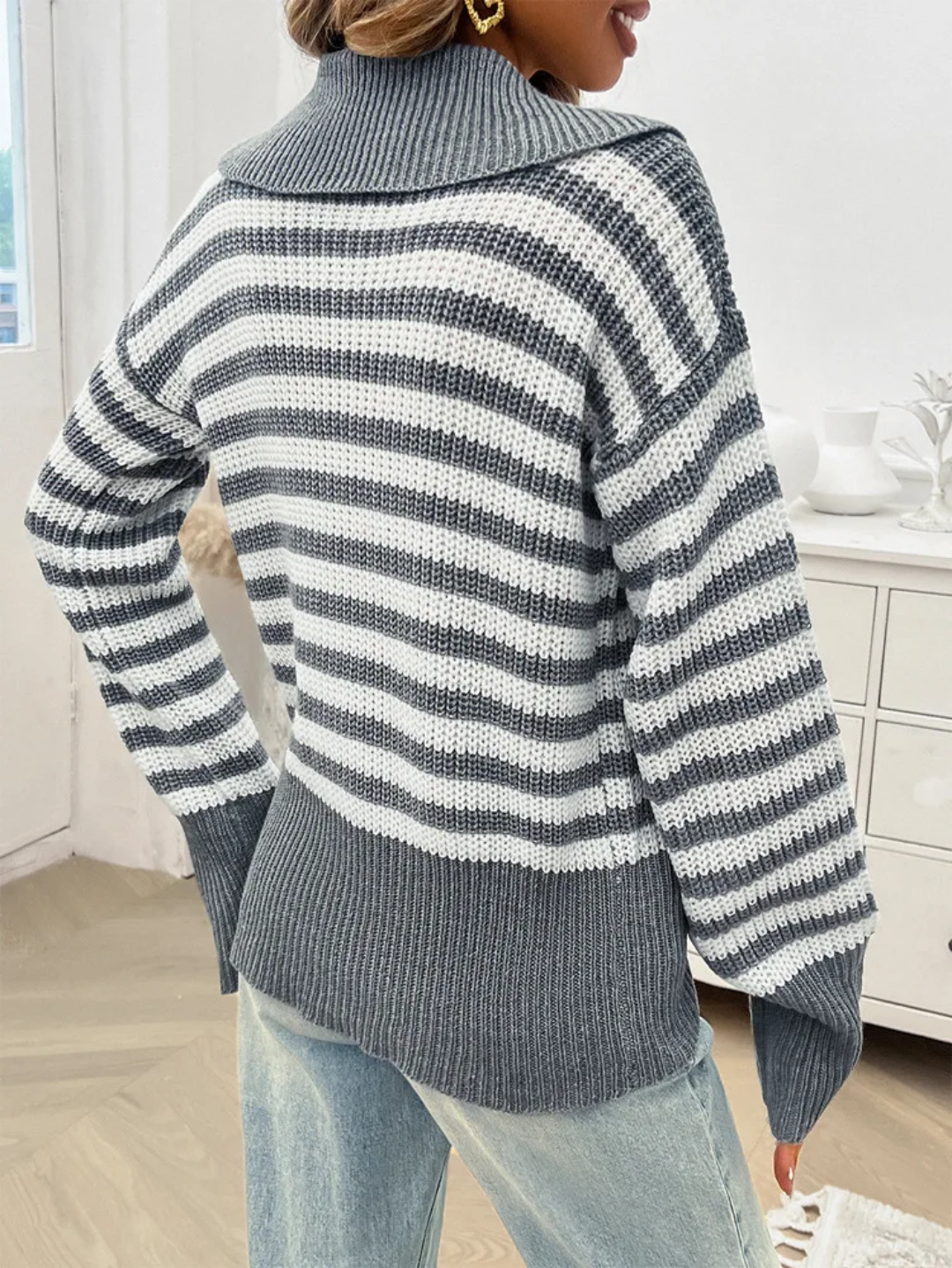 Este suéter casual apresenta uma gola polo elegante e mangas longas listradas, sendo perfeito para o outono. Com seu estilo...