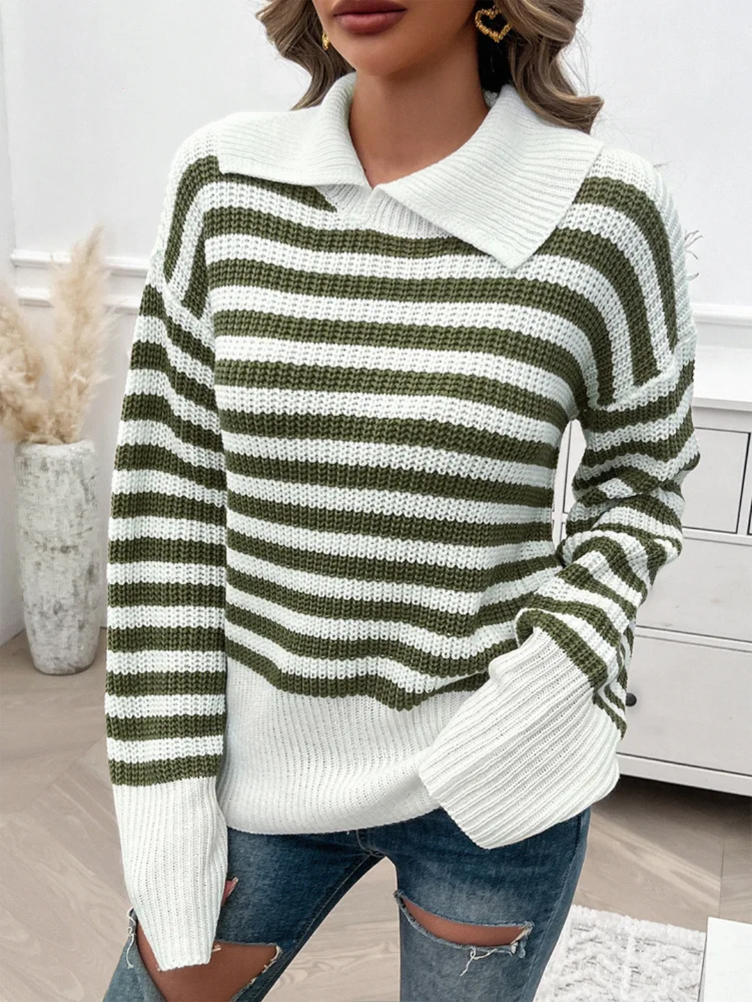 Suéter de Gola Polo Casual de Manga Longa com Listras, para Outono 182