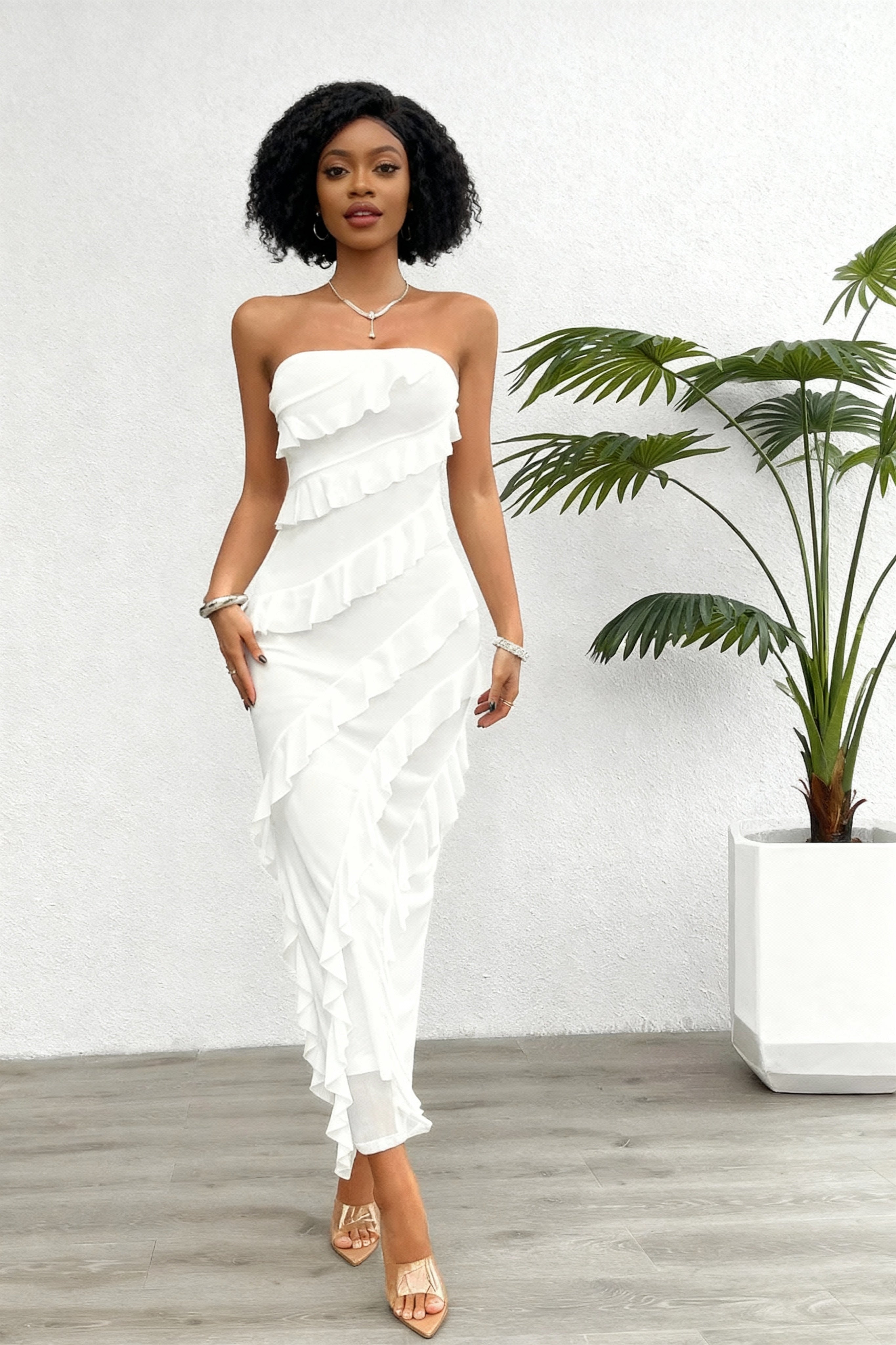Vestido Longo com Bainha sem alças, Múltiplas Camadas, Estilo Folha de Lótus com Babados 147