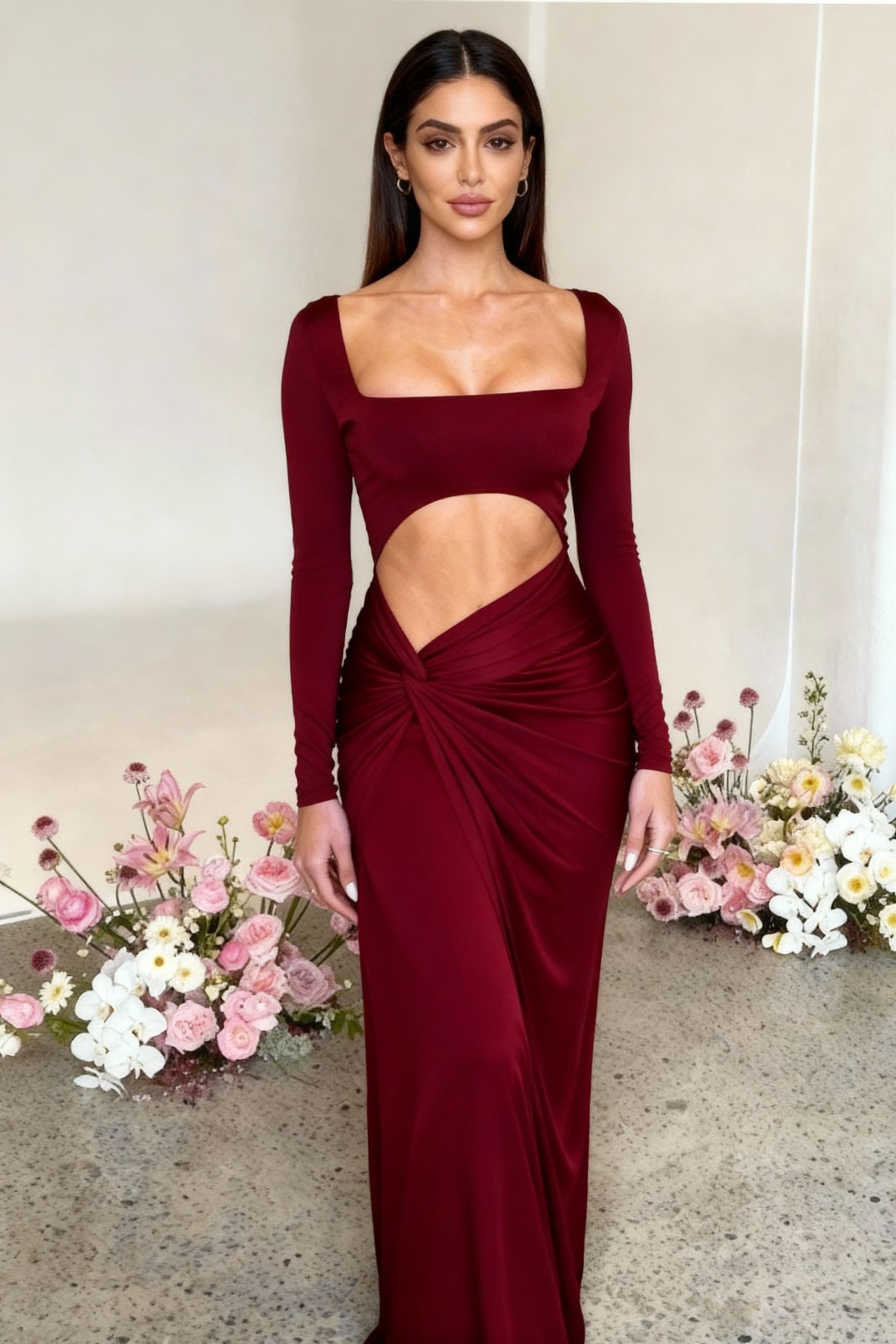 Acentue sua beleza com o Vestido Longo Feminino com Decote Canoa. Seu elegante detalhe torcido na frente e fenda na coxa realçam sua silhueta em um estilo exclusivo e de alta qualidade. Perfeito para ocasiões especiais que exigem sofisticação e bom gosto.